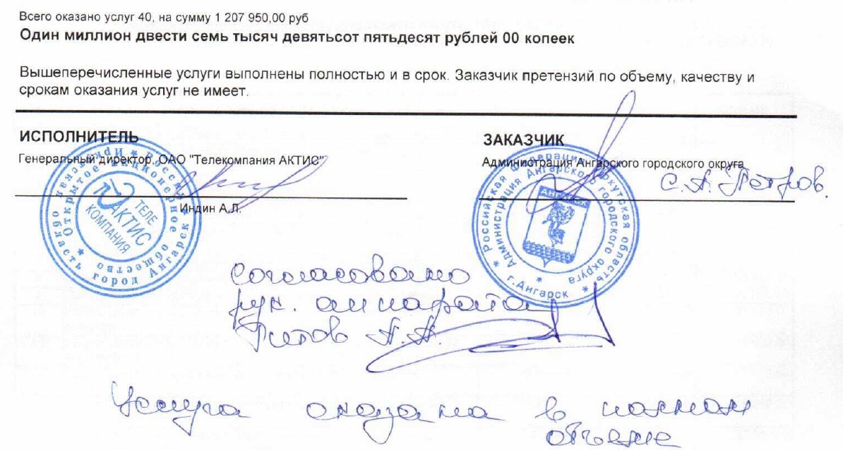 Для тех, кто все еще не понял, поясняем. Мэрия Ангарска заключила контракт на сумму более миллиона рублей с телекомпанией Актис, а уже через два дня, по документам, было проведено выполнение этого контракта, после чего деньги были выплачены и получены телекомпанией. Оставшиеся неосвоенными 52 тысячи рублей проведены еще одним актом, уже от 8 сентября.