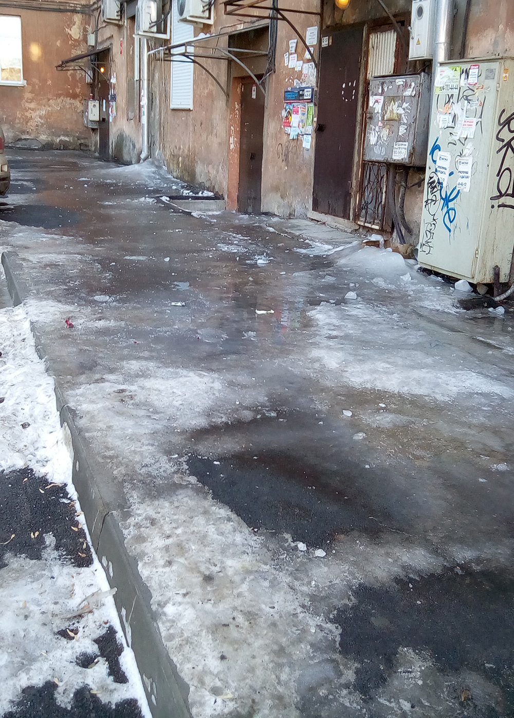 Весь двор - чистый лед, хоть каток устраивай. Каждый день кто-то травмируется. Дома у нас старые, живут в основном люди пожилые. Ежедневно выходим во двор с мыслью, где будем ночевать - дома или в травматологии.