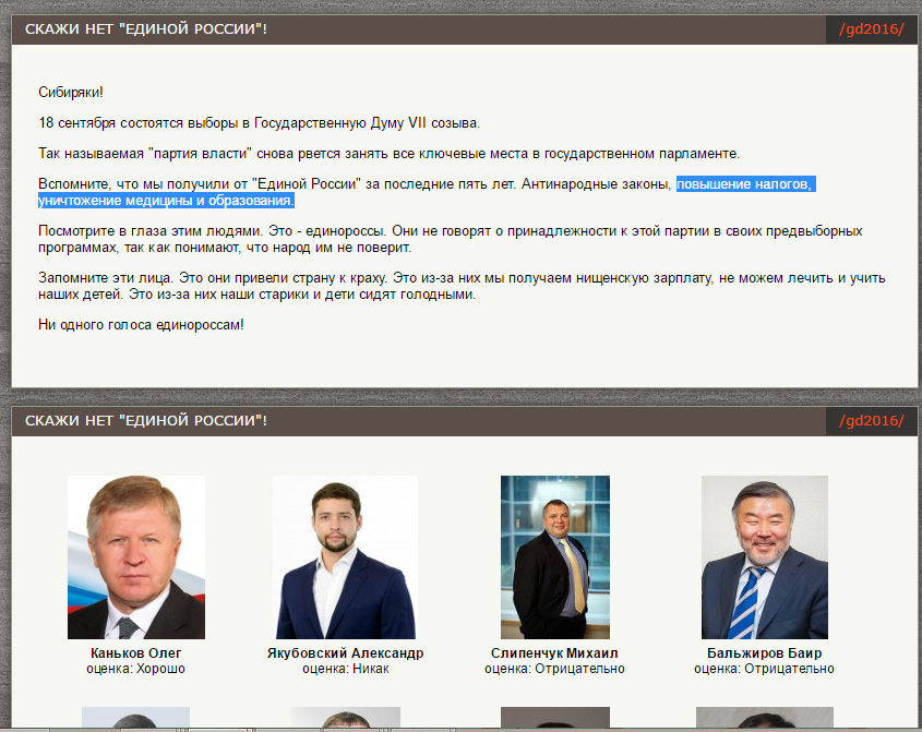 Авторы проекта призывают не дать ни одного голоса единороссам на выборах в Госдуму VII созыва, которые состоятся 18 сентября 2016 года.