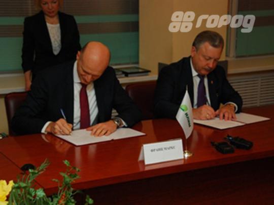 Гендиректор «Группы Илим» Франц Маркс и мэр Сергей Серебренников подписывают соглашение о соцпартнёрстве на сумму 100 миллионов рублей