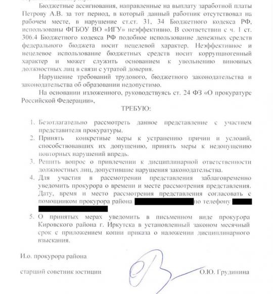 По информации «Байкал24», до сих пор неизвестно какие взыскания – хотя бы дисциплинарные – были наложены на ответственных за выявленные прокуратурой нарушения. Так что бесконечный бардак в ИГУ– он для всех, а вот отвечать за него будут только опальные сотрудники, такие, как Алексей Петров.