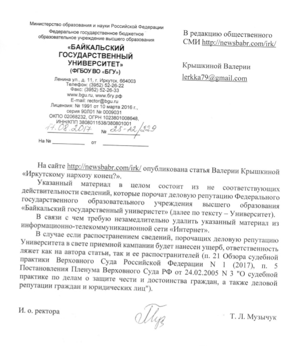 В ответ на публикацию исполняющая обязанности ректора БГУ Татьяна Музычук прислала в редакцию Бабра письмо, в котором в ультимативной форме потребовала удалить статью. Интересно то, что и.о. ректора является профессиональным журналистом, однако, по всем признакам, не имеет никакого представления о конституционной свободе слова и правах журналистов.