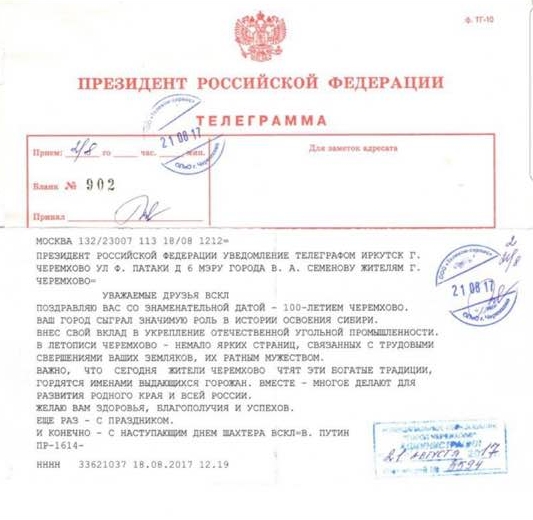 Мэр Черемхово Вадим Семенов получил телеграмму от президента Владимира Путина с поздравлениями со 100-летним юбилеем города и наступающим Днем шахтера. Текст телеграммы в качестве «сюрприза» собирались зачитать жителям во время празднования, однако кто-то выложил скан телеграммы в соцсети.