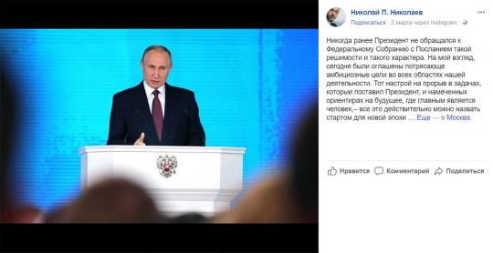 Депутат Государственной думы от Иркутской области Николай Николаев в своём аккаунте Facebook разродился восторженным постом по поводу послания президента Федеральному собранию.