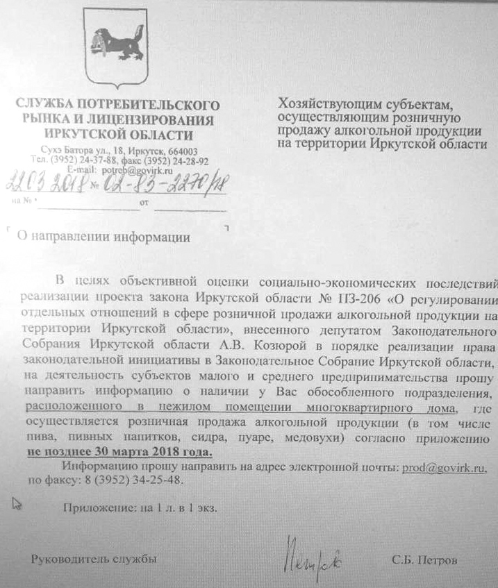 Всем предпринимателям региона разосланы письмо с предложением добровольно сообщить о наличии обособленного помещения в жилом доме, где торгуют алкоголем.