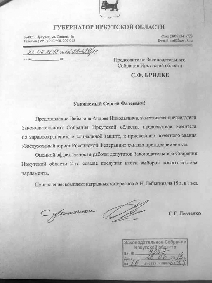 В грубой форме губернатор отказал спикеру Законодательного собрания, секретарю Иркутского регионального отделения партии "Единая Россия" Сергею Брилке в его просьбе ходатайствовать о присвоении вице-спикеру, единороссу Андрею Лабыгину высокого звания "Заслуженный юрист РФ".