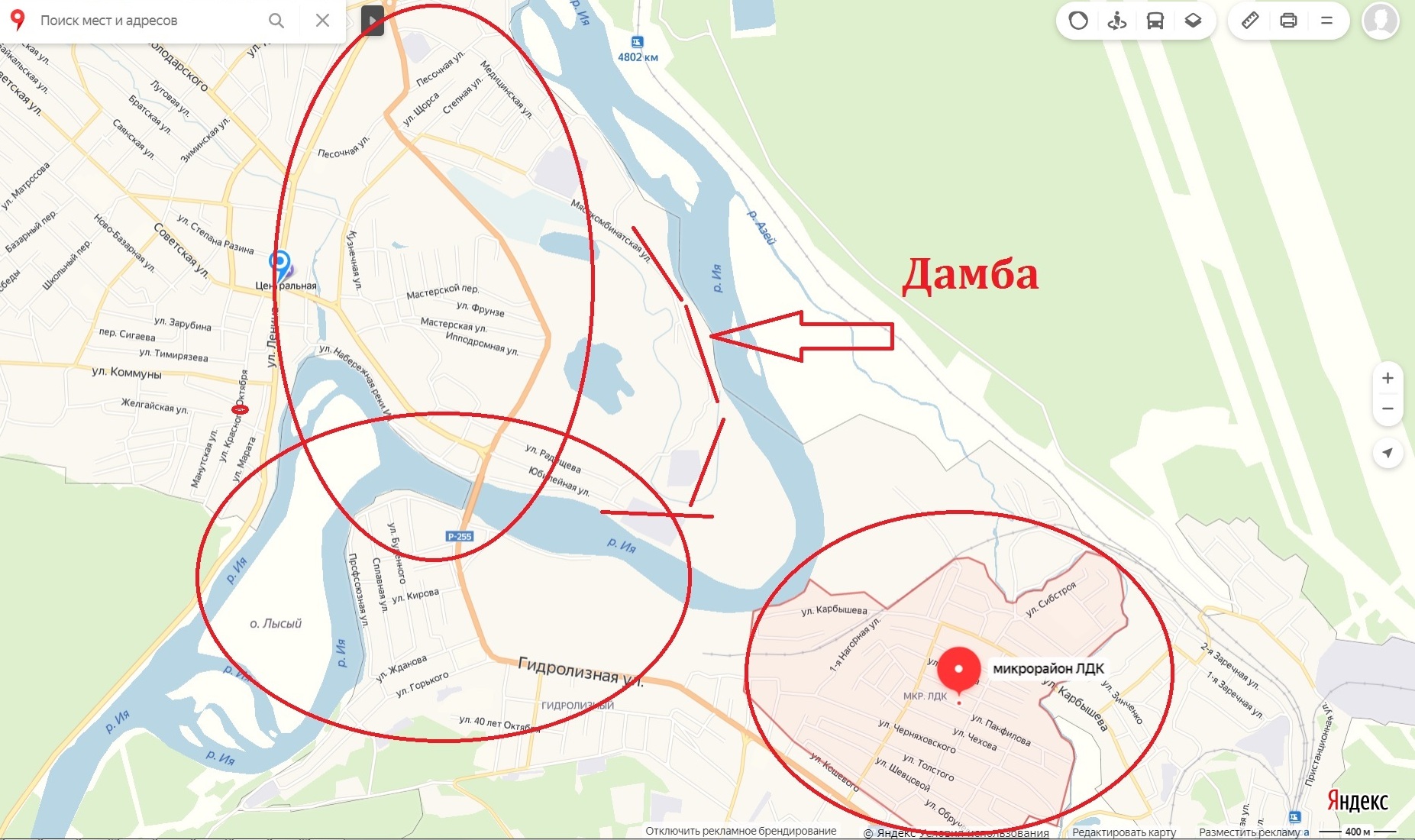 Примерная схема: кружками показаны основные районы затопления.