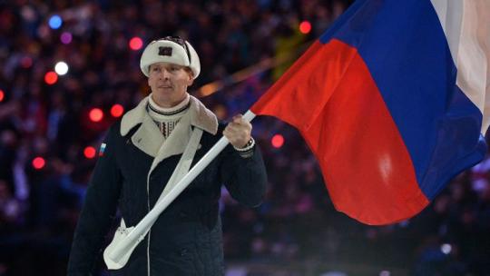 7 февраля 2014 года. Сочи. Открытие Олимпийских игр. Александр Зубков - знаменосец сборной России. Фото AFP