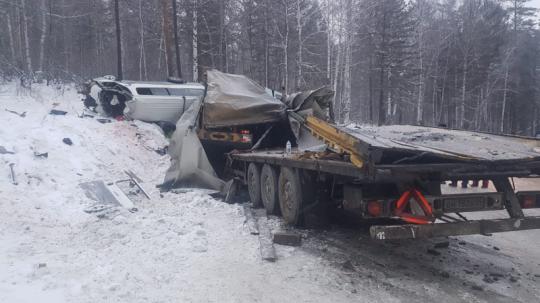 Грузовик ехал из Читы в Челябинск. 56-летний водитель грузовика «Фредлайнер», столкнувшегося с микроавтобусом «Тойота» в районе 33-го километра трассы Р-258 «Байкал», утверждает, что у его автомобиля отказали тормоза.