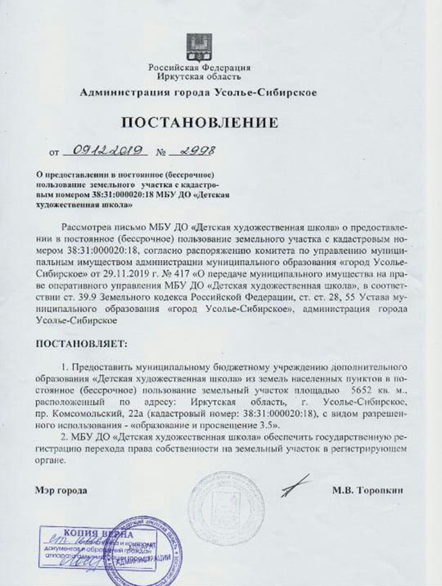 На самом деле в январе 2020 года Дума города Усолье-Сибирское приняла логичное и трезвое решение передать здание и прилегающую территорию муниципальному бюджетному учреждению «Детская художественная школа г. Усолье-Сибирское» Старое здание художественной школы способно вместить всего 250 учащихся, при том что учиться в ней хотят не менее 600 человек.