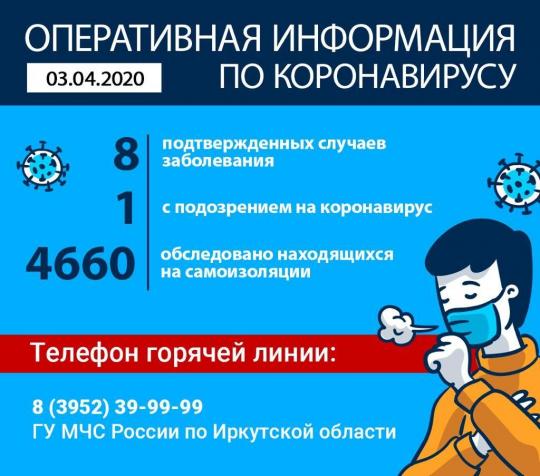 Под медицинским наблюдением на самоизоляции находится более восьми тысяч жителей области. На базе ФБУЗ «Центр гигиены и эпидемиологии в Иркутской области» проведены лабораторные исследования на наличие РНК коронавируса SARS-CoV-2019 в анализах 4660 человек.