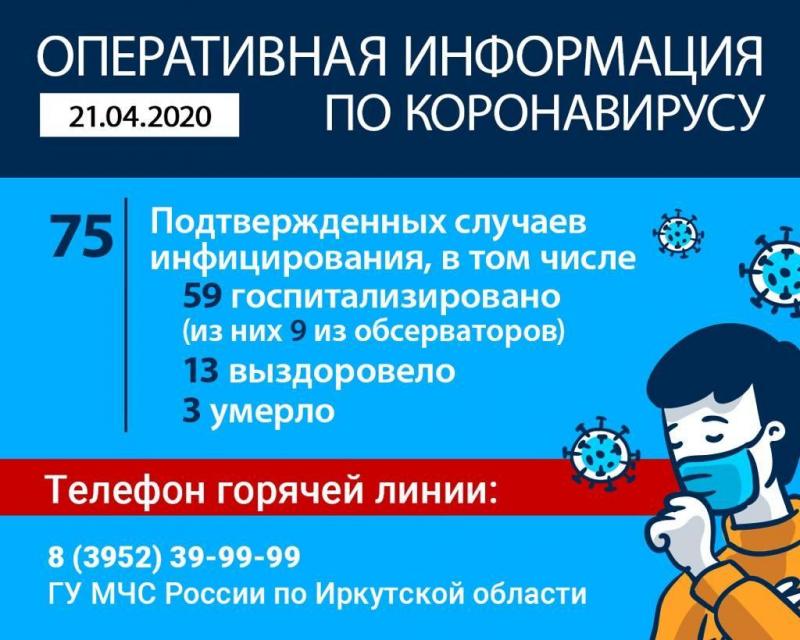 По данным на утро 21 апреля, в Иркутской области зафиксировано 75 случаев заражения COVID-19. За сутки коронавирус подтвердился у четырех человек.