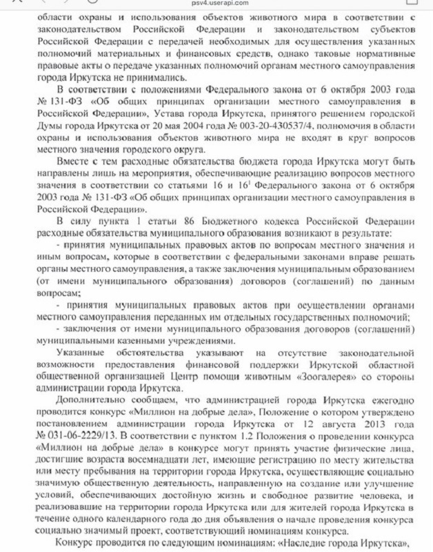 «Прошел ровно месяц с момента нашего обращения, и вот, наконец, получен ответ из городской администрации. Честно говоря, для того чтобы изложить итоговую мысль, не нужно было тратить время на такое количество текста. Кстати, если кто-то заметил, о «Доме природы» в нашем письме не было ни слова, а отказывают, кажется, именно ему. Тяжело прокормить как раз тех, кто съехал на «Фортуну» - приютских, которых к нам много лет направляли именно городские и областные власти, не имея желания заниматься такими проблемами», - пишет директор «Зоогалереи».