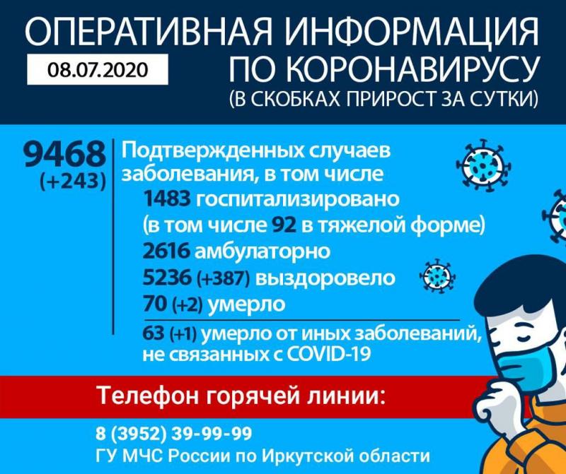 Число подтверждённых случаев заражения коронавирусом в Прибайкалье к утру 8 июля увеличилось на 243 человека. Число погибших возросло до 133.