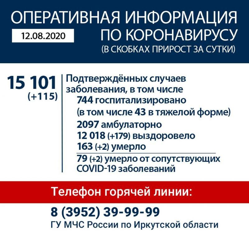 С начала пандемии в регионе зарегистрирован 15101 житель с подтверждённым коронавирусом. По данным на 12 августа, за сутки в Прибайкалье коронавирус подтвердился ещё у 115 человек.