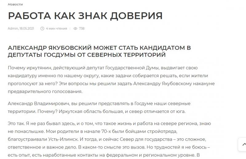 Конечно, потешный праймериз «Единой России», в котором сейчас участвует Якубовский, боевым крещением назвать сложно. Но по опубликованным перед этим мероприятием материалам в местных СМИ уже понятно, чем иркутский мажор думает взять суровых северян.