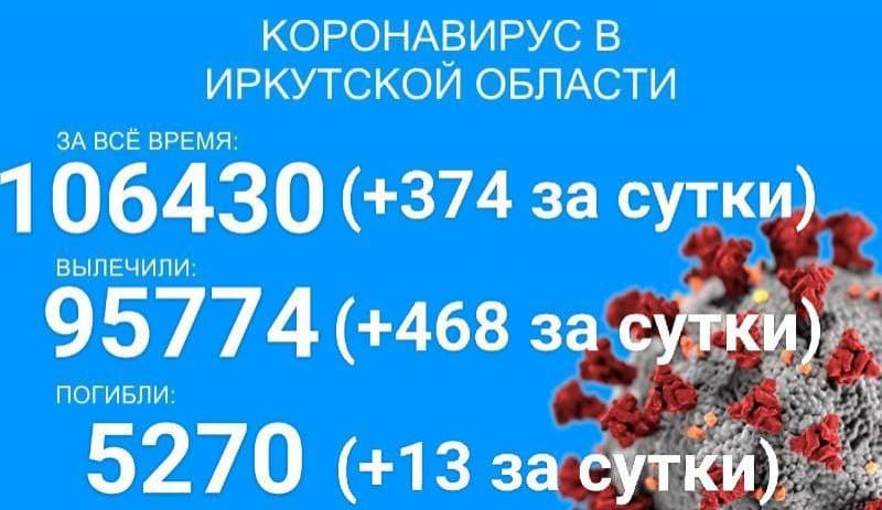 По данным оперштаба Иркутской области на утро 22 сентября, в регионе официально зарегистрировано 106430 подтверждённых тестами ПЦР случаев заболевания коронавирусом. За сутки выявлено 374 новых случаев, из них один вахтовик и 46 детей. Всего в Прибайкалье болеет коронавирусом 435 детей.