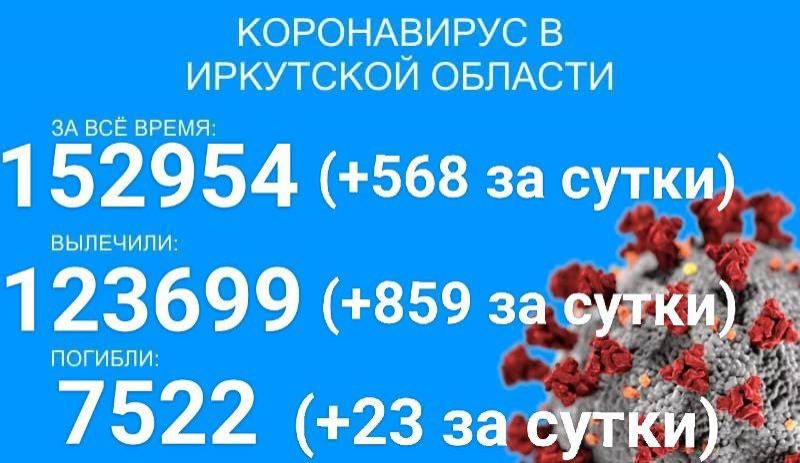 По данным оперштаба Иркутской области на утро 23 декабря, зарегистрировано 152954 официально подтверждённых тестами ПЦР случаев заболевания коронавирусом. За сутки выявлено 568 новых случаев.