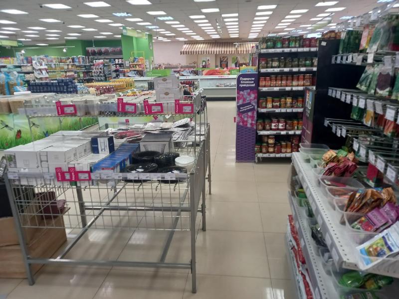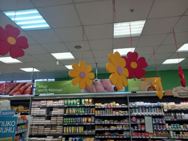 Магазин занимает обширную площадь, так что большинство проходов широкие. Однако есть и супер узкие, так что посетители получают дозу адреналина, когда бегут за последней пачкой гречки и пытаются ничего не свалить. Кроме того, в помещении присутствуют и другие препятствия. Например, цветочки, которые висят на потолке. Ежу понятно, что это всего лишь элемент декора, создающий атмосферу. Но покупатели ростом выше среднего могут не оценить эти «висячие сады». Так что подобное решение — не совсем удачное.
