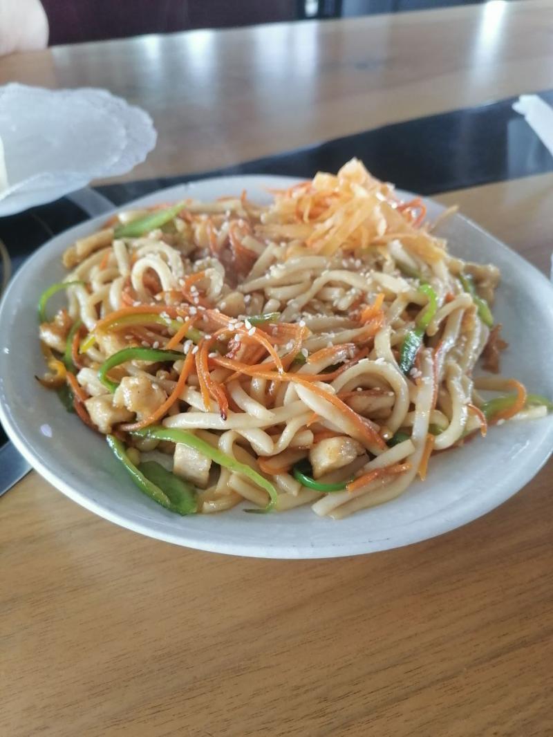 Второе горячее блюдо — лапша вок. В меню указано, что она может быть либо с морепродуктами, либо со свининой. А мы решили узнать, могут ли в «Золотом карпе» по желанию клиента поменять ингредиенты. Оказалось — могут. Плюсик в графу сервиса! Вместо свинины нам положили курицу. Блюдо тоже огромное, мяса достаточно, лапша круглая. Овощи нарезаны соломкой, посыпано кунжутом. А вот соуса могло бы быть побольше. Кстати, к лапше подали дополнительно горстку салата из капусты в той же тарелке. На наш взгляд — лишнее. 9 баллов из 10.