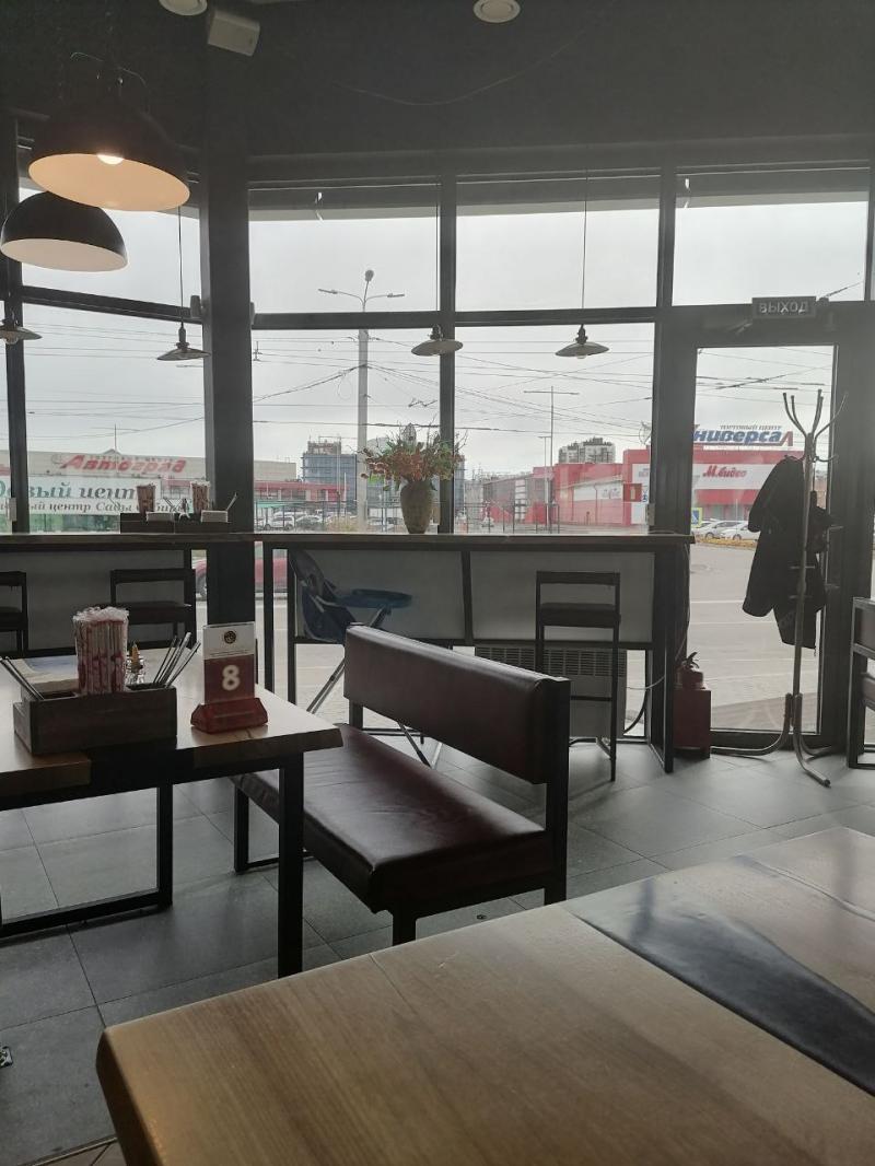 Атмосфера в кафе — обычная. Стены стеклянные, для любителей уединения не особо подойдёт. Жалюзи есть, но днём их не опускают. Музыка совершенно негромкая. За атмосферу — 9 баллов из 10, один балл снимаем за вешалки.
