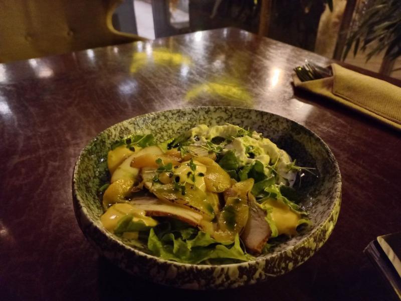 «Салат с курицей и персиком татаки» — единственное вкусное блюдо среди всех, взятых на пробу. В состав салата вошли маринованные помидоры черри, курица гриль, лист салата, соус манго-чили и сыр пармезан. И, конечно, главным ингредиентом салата является персик татаки. Что это вообще за персик такой? Оказывается, татаки — японский способ приготовления мяса и рыбы. Причём тут персик — непонятно. По идее этот персик должен быть замочен в уксусе и обжарен на огне с имбирём. Но, судя по всему, персик в салате был просто обжарен. Необычный и изысканный вкус блюда это никак не испортило.