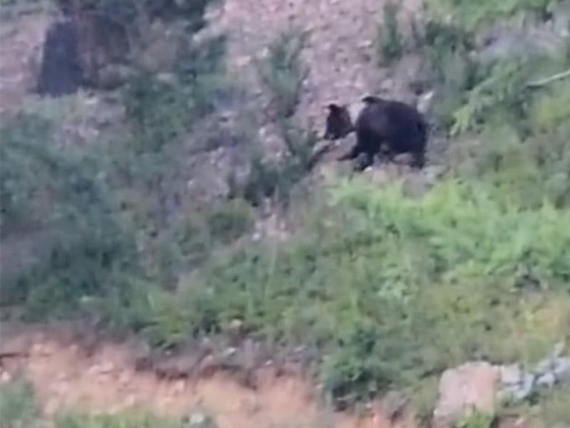 Люди заметили косолапого на склоне. Медведь на крики не отреагировал, агрессии или страха не проявлял: прошёл около троп и направился в лес.
