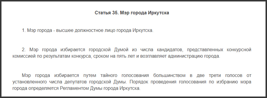 Однако. В сентябре 2024 года, независимо от результатов президентских выборов, пройдут выборы в Думу Иркутска. Мэр Иркутска избирается на конкурсной основе решением депутатов числом в две трети от числа народных избранников. Попасть в кандидаты и потом убедить две трети Думы в своей исключительности — это будет отдельный квест, о котором мы расскажем в следующих статьях.