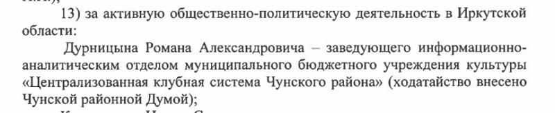 Кстати, еще одна почетная грамота ушла руководителю областного молодежного парламента и журналисту «Вести Иркутск» Ивану Комелькову. Но представили его культорганизатором ангарского ДК «Нефтехимик», где разносторонний Иван, оказывается, успевает трудиться под началом еще одного депутата парламента – Антонины Кокошниковой. Да так успешно, что именно в этом амплуа его наградили за «активную общественно-политическую деятельность». За то же самое, кстати, за что хотели наградить чунского Дурницына, но тот крышей не вышел (неизвестно, кстати, помощник ли он до сих пор подрастерявшей влияние Натальи Дикусаровой).
