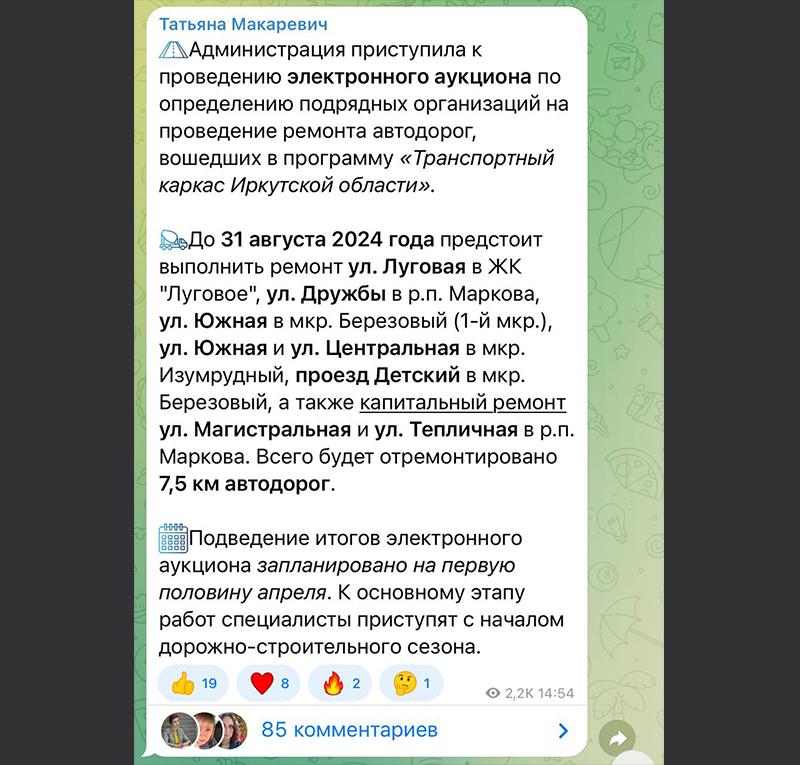 Так, «расцелованная» в декабре минувшего года целым строем областных чиновников, в этом году марковская администрация получила небывалый «улов» по дорожным подрядам. В 2024 году в рамках реализации проекта «Транспортный каркас» в Маркова должно быть отремонтировано восемь дорожных участков. Об этом глава гордо сообщает в своем телеграм-канале: