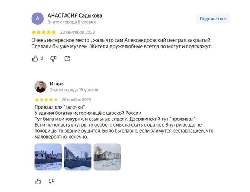 В настоящее время Александровский централ всё так же ждёт своего часа реставрации. А пока местные жители и гиды проводят частные экскурсии по селу, включая развалины некогда центральной тюрьмы. Судя по отзывам в Яндекс Картах, спрос у туриста есть, а будет ли предложение?