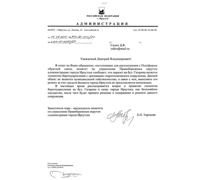 Ну а как известно, «мэр» Иркутска ни за что не отвечает, на любой вопрос или претензию отправляют в профильный отдел».