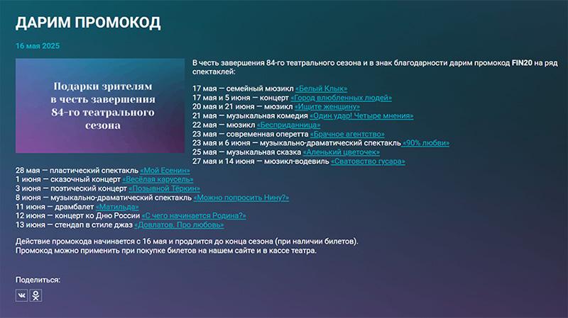 Иркутский музыкальный театр под видом заботы о зрителях раскрутил карусель щедрости и ввёл промокод на 20 (!) спектаклей из репертуарной афиши мая и июня.