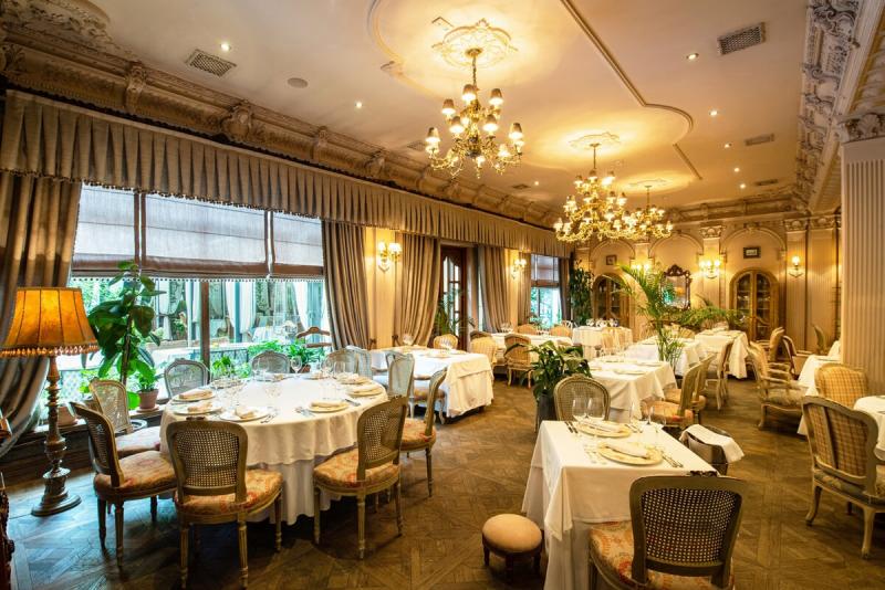 Внутри все выглядит именно так, как обычно представляют «дорогой ресторан» в адресованных людям попроще фильмах, то есть это неоклассические дворцовые интерьеры, колонны, люстры, скатерти и вот это вот все.