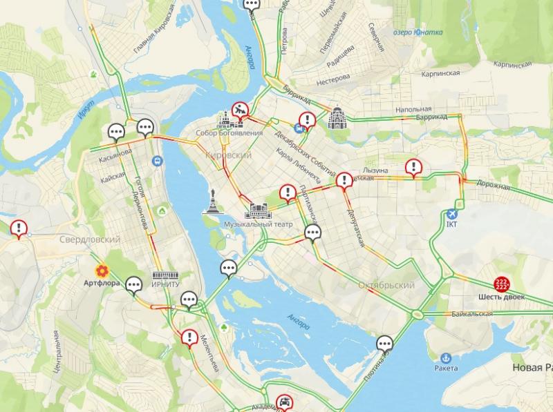 При этом 30-градусный утренний мороз количества автомобилей на дорогах Иркутска не уменьшил: в 8 часов утра пробки в областном центре оценивались в восемь баллов. Стояли и Академический мост, и Глазковский вместе с улицей Маяковского, и плотина ГЭС, и Байкальская, советская, Декабрьских Событий, Рабочего Штаба и Сурнова. К 10 часам утра ситуация улучшилась, но Академическая, Кайская года, Маяковского и Глазковский мост, Ленина, подъезды к Академическому мосту ещё мигают красным на картах.