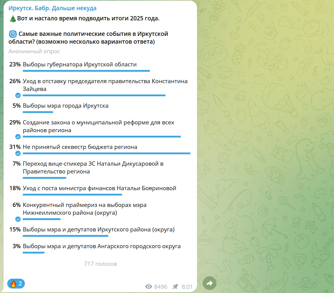 Подходит к концу 2025 год, ставший для Иркутской области временем напряженных политических процессов и значимых кадровых изменений в стенах Серого дома. Результаты серии анонимных опросов в телеграм-канале «Иркутск. Дальше некуда» позволяют оценить, какие события и персоны региональной политики оставили наиболее яркий след в умах жителей.