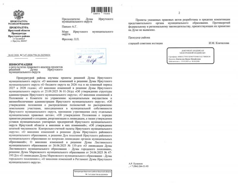 Было озвучено, что на имя мэра округа и председателя Думы прокуратура Иркутского района направила информацию 4-х листах (!) о результатах правового анализа проектов решений Думы, вынесенных на заседание. В частности, отмечалось, что проект решения «Об организации похоронного дела на территории Иркутского муниципального округа» не соответствует действующему законодательству. В этой связи он не может быть принят думой и нуждается в доработке, как и еще ряд нескольких положений, вынесенных на Думу.