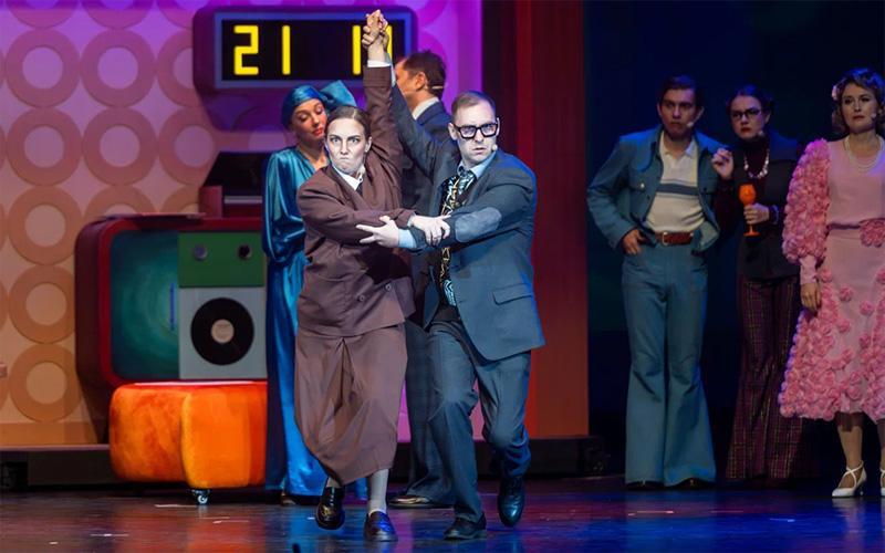 Сценография Ольги Грицаевой яркая и стильная, но больше подошла бы к фантастическому мюзиклу по сюжету каких-нибудь Стругацких, а не к производственной мелодраме эпохи соцреализма. По этой же причине карикатурно выглядят вставные элементы из 1970‑х: шнуровые телефоны, настольные калькуляторы, гранёные стаканы и наградные вымпелы. В какое время попал зритель? Да какая разница.