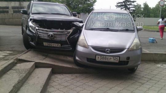 Инцидент произошел на улице Перенсона в Красноярске. По словам очевидцев, женщина, находившаяся за рулем автомобиля «Ноnda Fit», перепутала педали газа и тормоза, в результате чего протаранила внедорожник «Lexus». После этого машину виновницы ДТП вынесло на тротуар.