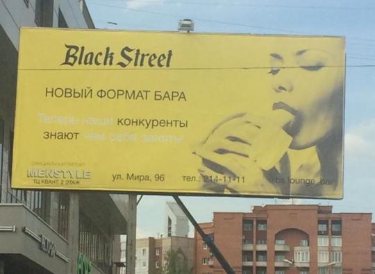 Антимонопольная служба рассмотрела жалобу на баннер, рекламирующий бар «BlackStreet», на котором изображена девушка с весьма двусмысленным бананом во рту. Слоган рекламы гласит: «Black Street. Новый формат бара. Теперь наши конкуренты знают, чем себя занять!».