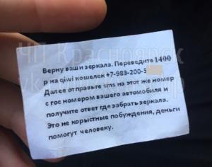 В Красноярске набирает силу новый способ отъема денег у населения. На этот раз воры крадут боковые зеркала у автомобилей и требуют за них выкуп. Об этом рассказали очевидцы в соцсети «ВКонтакте».