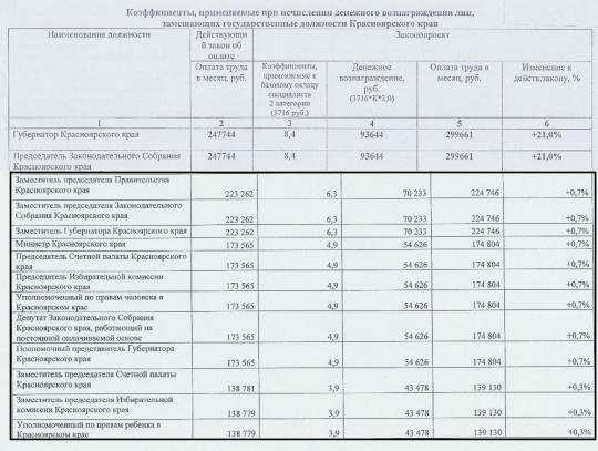 13 мая 2019 года губернатор Красноярского края подписал этот законопроект с пометкой «Поддерживаю». Согласно этому законопроекту зарплата губернатора и председателя Заксобрания Красноярского края Дмитрия Свиридова повысится на 21%. Оба, кстати, являются представителями партии «Единая Россия». Остальным же оплату предлагается поднять на 0,7%, а по трем должностям всего на 0,3%.