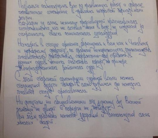 Аркадий Волков просит обратить внимание общественности и властей на условия содержания арестованных в залах судов Красноярского края — на металлические клетки в зале суда, на антисанитарию в помещениях «образца пыточных камер НКВД», где отсутствуют элементарные удобства, вроде туалета.
