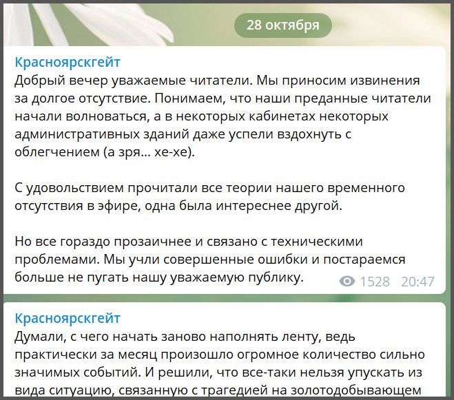 28 октября «КрасноярскГейт» воскрес и в бодро-идиотической тональности поведал, что имелись технические проблемы, и канал продолжает функционировать. Однако даже поверхностный анализ новых постов показывает, что когда-то мощная команда (либо один, но очень компетентный аналитик, связанный с силовиками) была заменена на стилистически безграмотную девушку, не способную без ошибок транслировать даже готовый текст. Совершенно очевидно, что у «КрасноярскГейта» сменились если не владельцы, то авторы.