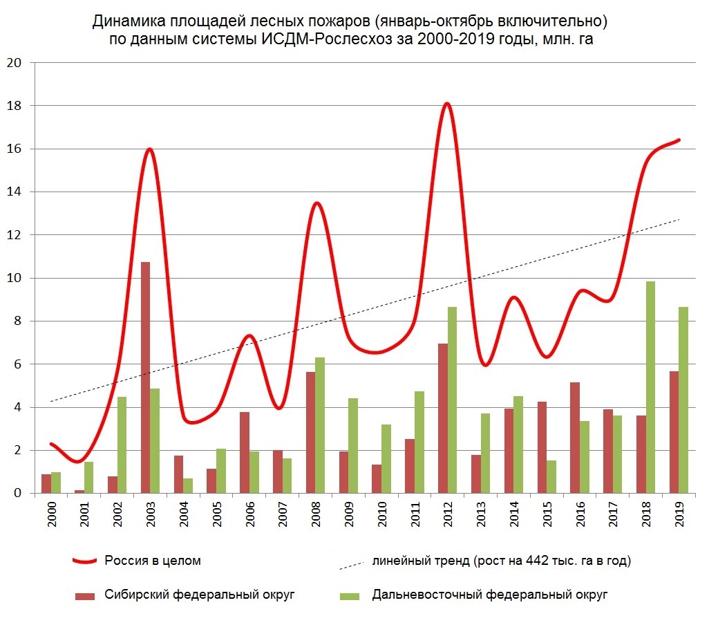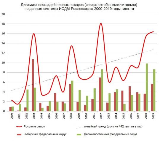 По оценке редактора лесного отдела «Гринпис России» Алексея Ярошенко, нынешний год так и останется вторым в 21 веке по общей площади лесных пожаров для страны в целом и для Дальнего Востока в частности, и третьим – для Сибири. Ярошенко также опубликовал наглядный график динамики площадей лесных пожаров за период с 2000 по 2019 год.