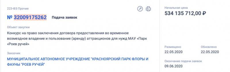Свежий тендер от «Роева ручья» стоимостью 534 миллиона рублей был размещён на сайте госзакупок 22 мая и предусматривает аренду аттракционов для нужд зоопарка сроком на 120 месяцев, то есть 10 лет.
