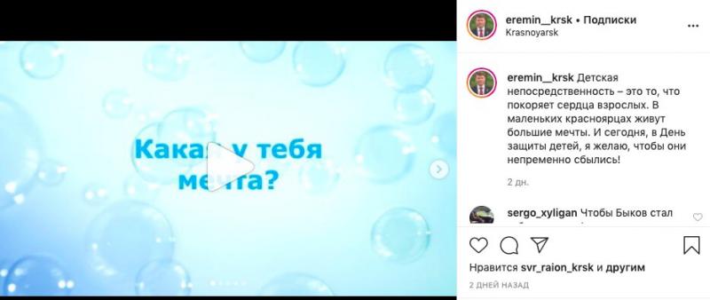 1 июня, в День защиты детей, красноярский градоначальник опубликовал в Instagram максимально тёплый и благостный пост: