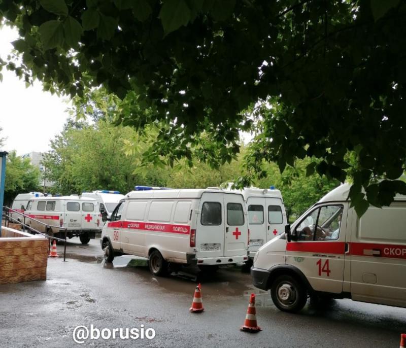 Очередь из машин скорой помощи в Клиническую больницу № 20 им. Берзона И.С. Туда направляют людей с диагнозом «пневмония». Источник: телеграм-канал borusio