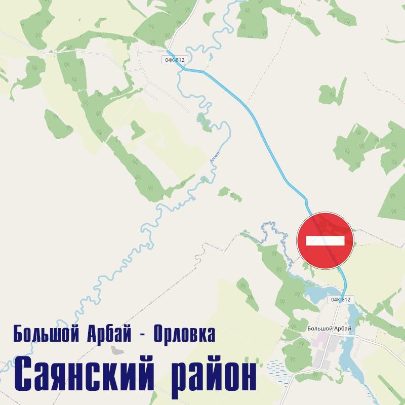В Саянском районе закрыт проезд по дороге «Большой Арбай – Орловка». На первом километре маршрута глубина перелива достигает 70 сантиметров над дорогой.