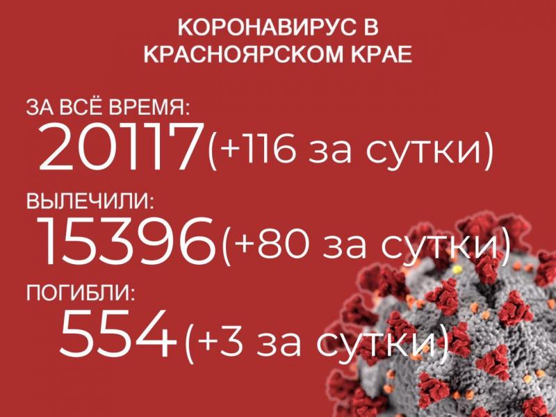 У 116 человек в Красноярском крае выявили COVID-19 за прошедшие сутки. Также за это время 80 пациентов полностью излечились, еще трое умерли. Об этом сообщает местный оперштаб по коронавирусу.